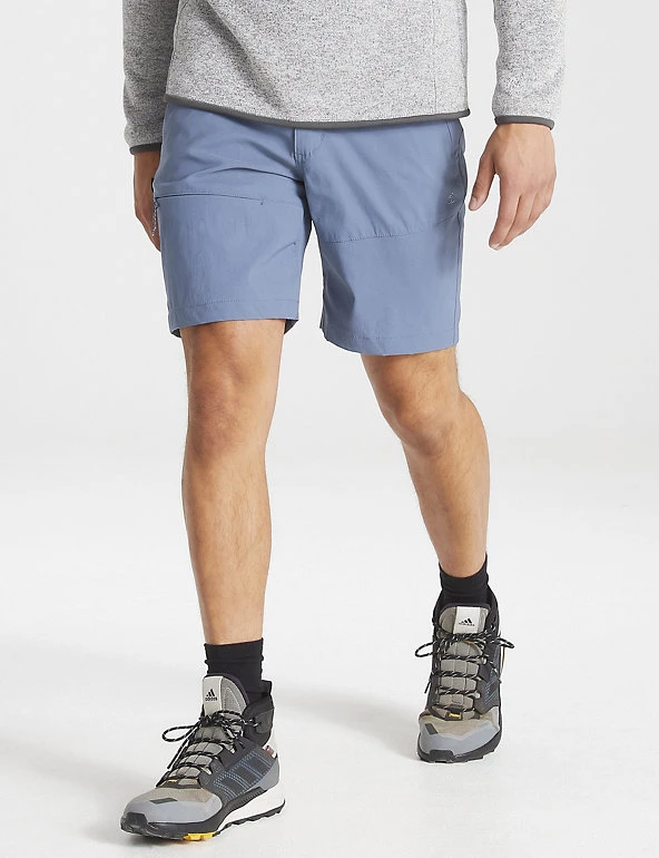 Keep it simple with these chino shorts from Craghoppers. They’re cut in a tailored fit with a classic button and zip fastening and elasticated waist for added comfort. There are two zipped pockets at the hips as well as pockets on the back and thigh. Subtle branding completes the look. Made with recycled polyester.