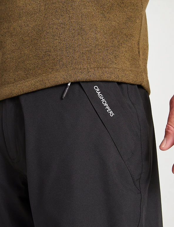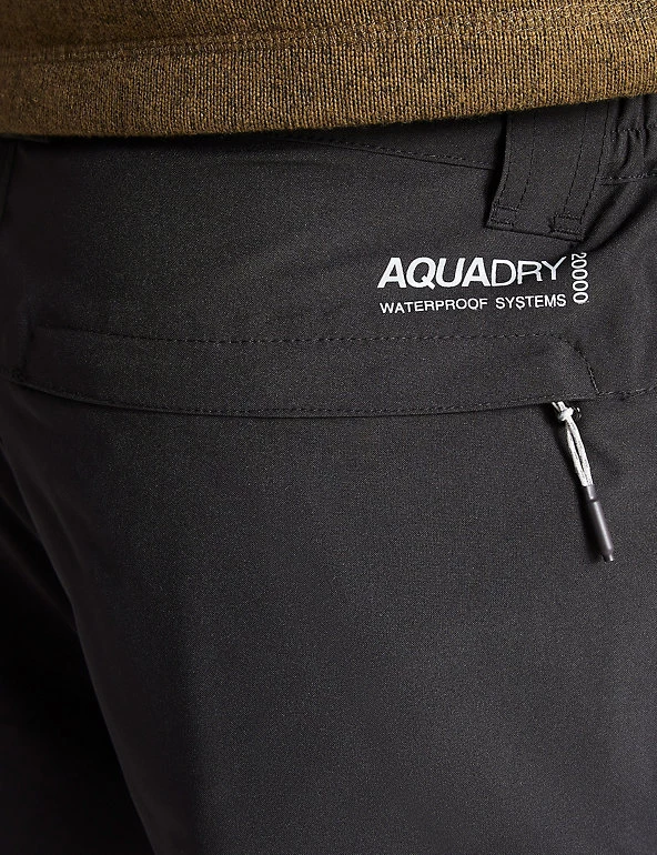 These waterproof trousers from Craghoppers keep you protected wherever your adventures take you. They’re cut in a traditional tailored style, with a flat front. A part elasticated waist gives maximum comfort, and heel tape ensures extra durability in this high-wear area. The clever AquaDry membrane combines a durable water-repellent finish with a breathable inner layer, so you stay dry and comfortable. Handy zipped pockets keep your essentials secure, and riptape hem adjusters give a snug fit at the ankles. Made with recycled polyester.