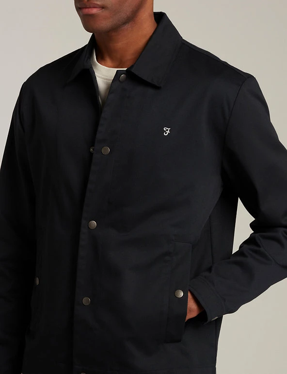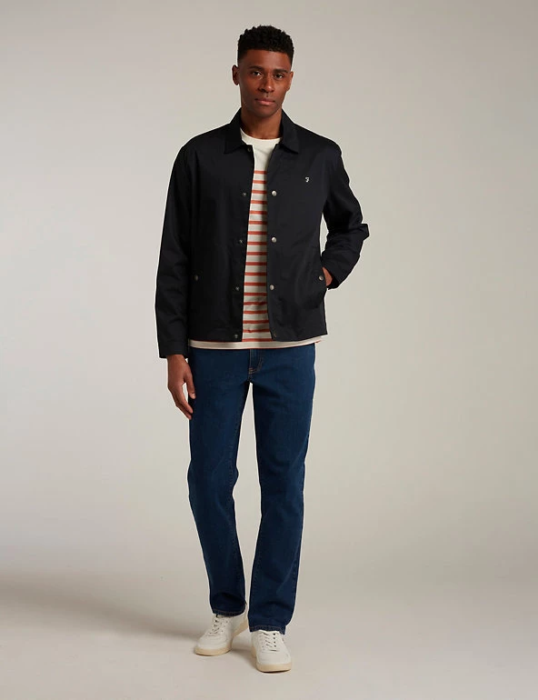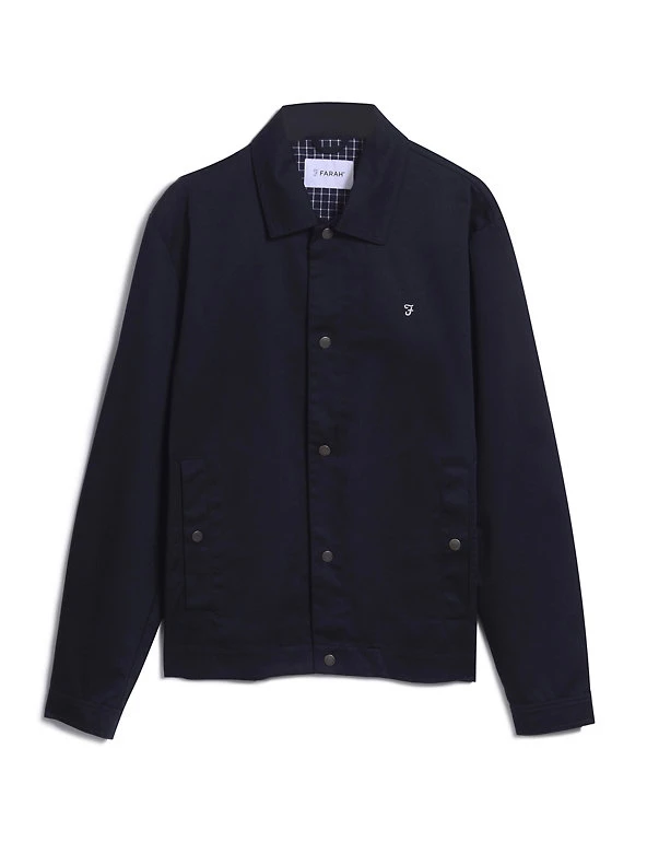 Embrace smart-casual days with this cotton-rich Harrington jacket from Farah. It’s designed in a comfy regular fit with a smart collared neck and an easy snap-button closure. This stylish piece is finished with signature branding at the chest, a checked half lining and handy side pockets.