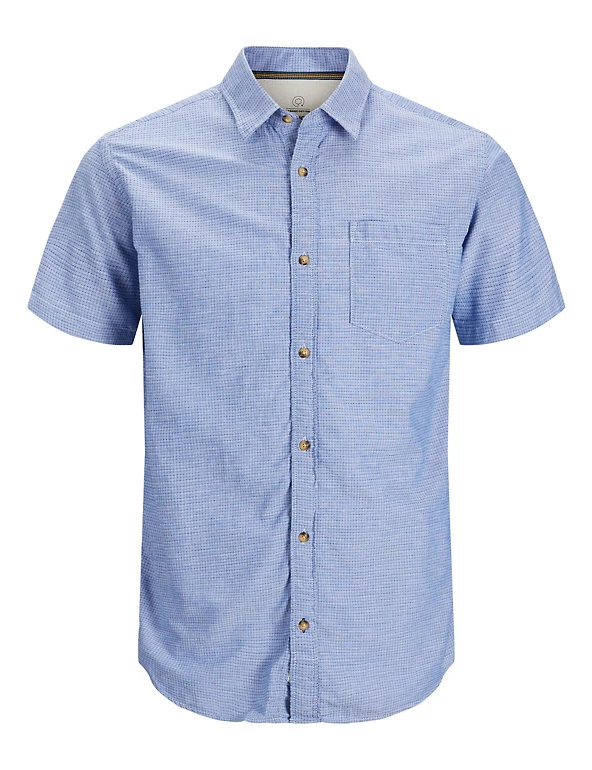 Get set for warmer days with this short sleeve shirt from JACK & JONES. It’s made to a sleek slim fit from pure, soft cotton. The laundered fabric has a micro-check pattern and the front is finished with a chest pocket. Made with recycled cotton.