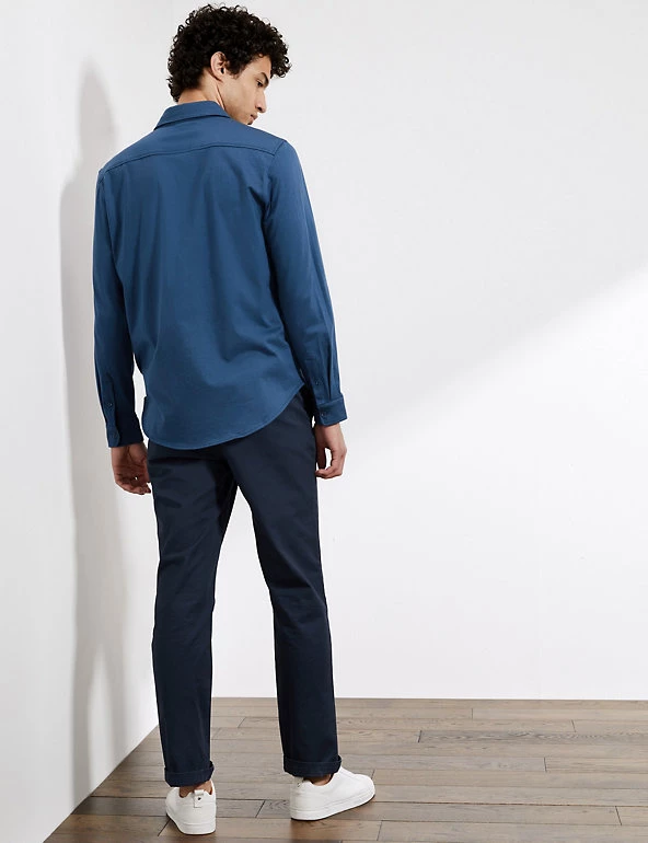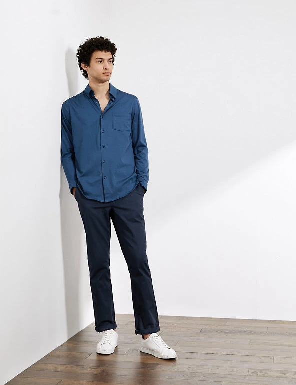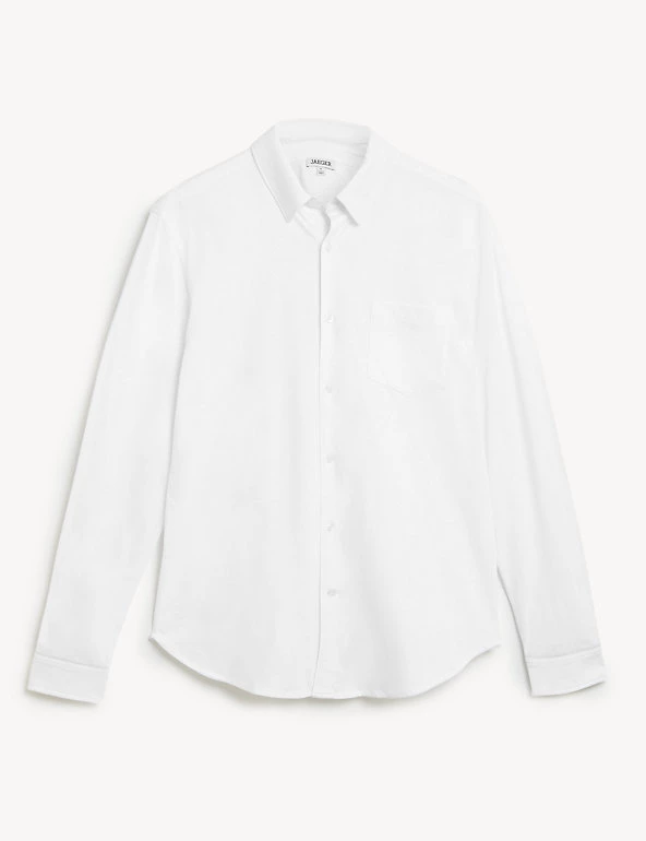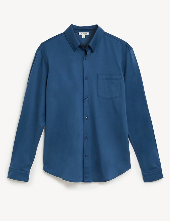 This Jaeger shirt has been made with mercerised pure cotton jersey, giving it a lustrous look and a super-soft hand-feel. It’s cut in a neat regular fit, with smart button-through fastenings. A touch of added stretch ensures extra comfort, and the hemline is curved so you can wear your shirt tucked in or out. A patch pocket on the chest adds a crisp finishing detail. This piece makes for ideal smart-casual work attire that can take you from day to night. Pair it with a jacket and chinos for a stylish business look, or with jeans and a suede jacket for an evening out.