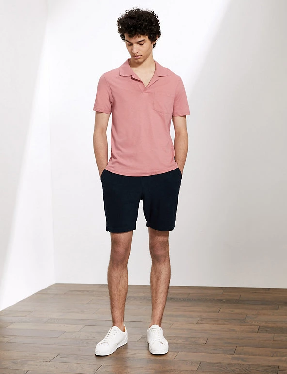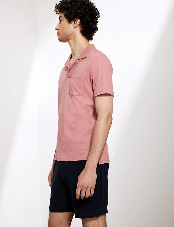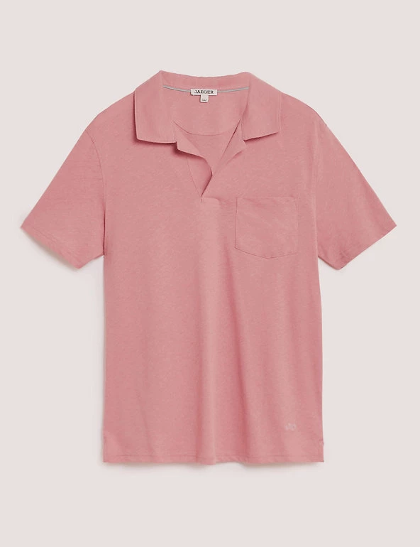 Crafted from a luxurious cotton and linen blend, this Jaeger polo shirt makes for an excellent warm-weather companion. It’s cut to a regular fit with airy short sleeves and a modern open collar. A chest pocket gives it a traditional feel and it’s finished with embroidered branding on the hem and back neck trim detailing. An ideal piece for outfit building, this versatile polo will look just as good with a jacket and chinos as it will paired with shorts on holiday.