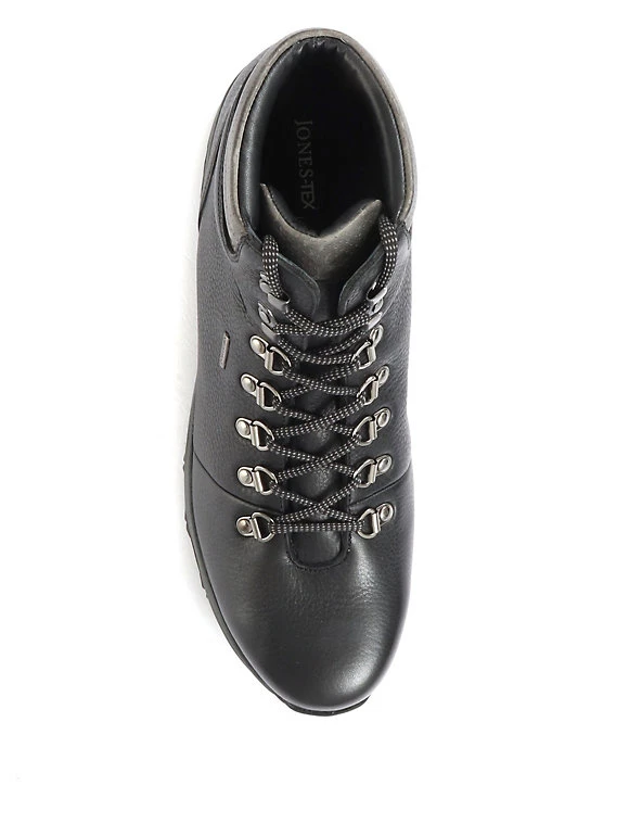 With their hiker-style look, these chunky leather boots from Jones Bootmaker are an ideal choice for weekend adventures. They’re made in a comfortable regular fit, with secure lace-up fastenings. Padded collars at the ankles give extra support and protection, while deep cleating on the soles provides plenty of grip. Branded metal hardware adds a discreet finishing touch.