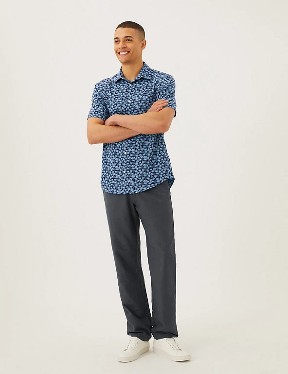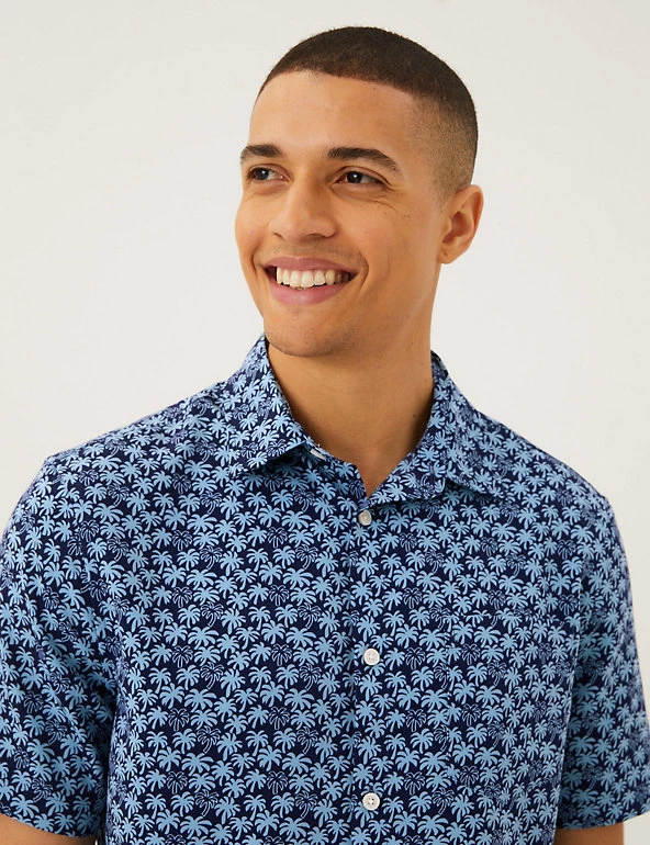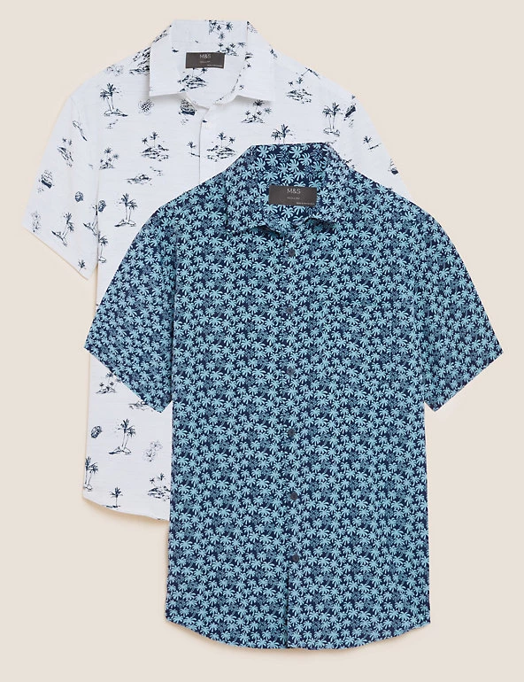 Give your casualwear edit a tropical refresh with these shirts. Pack of two regular fit shirts includes a palm print and a design featuring sea turtles, islands and sailboats. Both have breezy short sleeves, a classic collar and a button-through fastening. M&S Collection: easy-to-wear wardrobe staples that combine classic and contemporary styles.