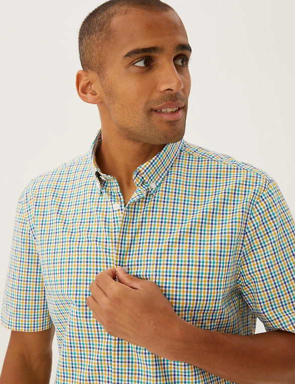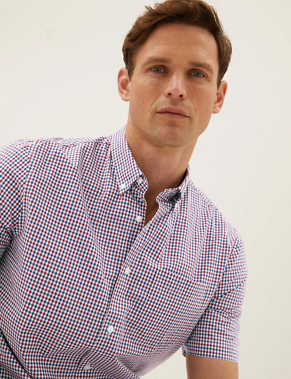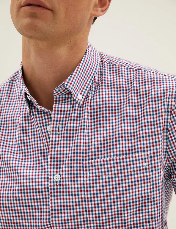 A gingham check gives a timeless feel to this pure cotton shirt. Regular fit design, with a button-down collar and button-through fastening for a classic look. Breezy short sleeves. Clever easy-to-iron finish means all this shirt needs is a quick press. W