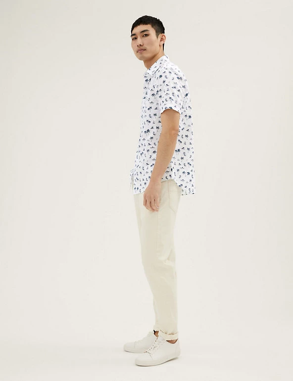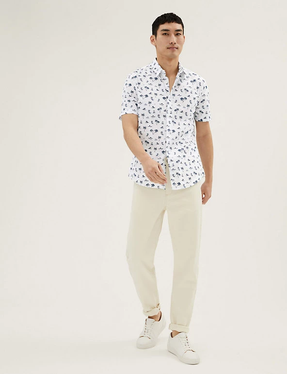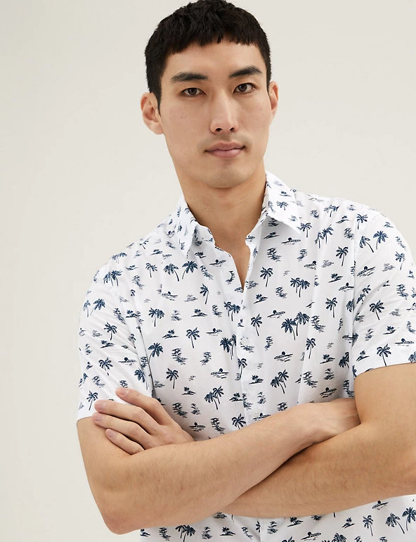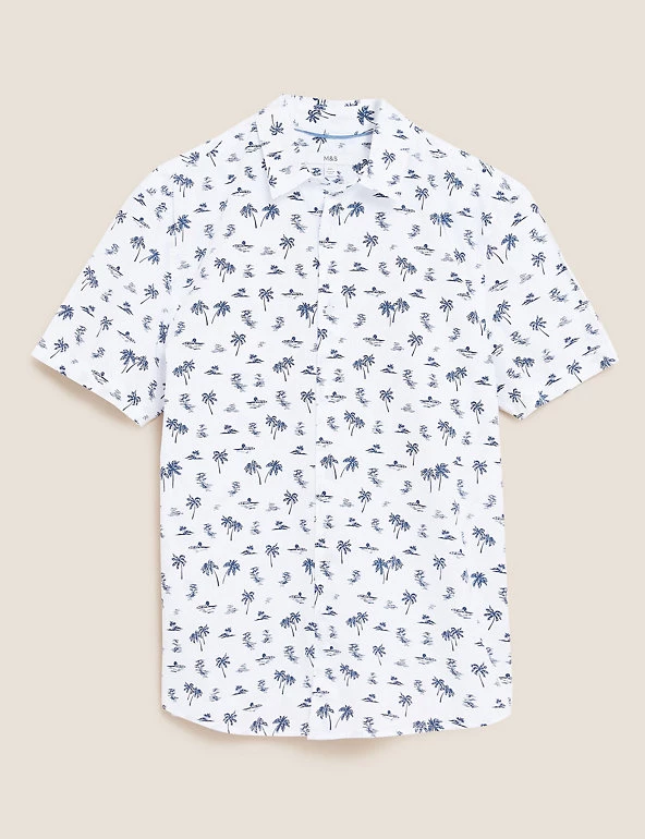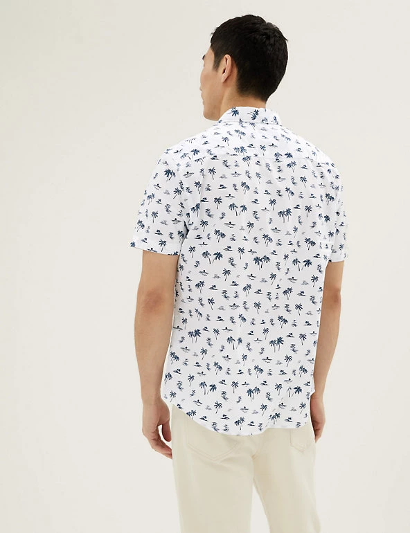 Get set for warmer days with this palm print short-sleeved shirt. Cut to a comfy regular fit from pure cotton fabric. A button-down collar adds a smart touch, while an easy-to-iron finish means it needs no more than a quick press. We only ever use responsibly sourced cotton for our clothes.