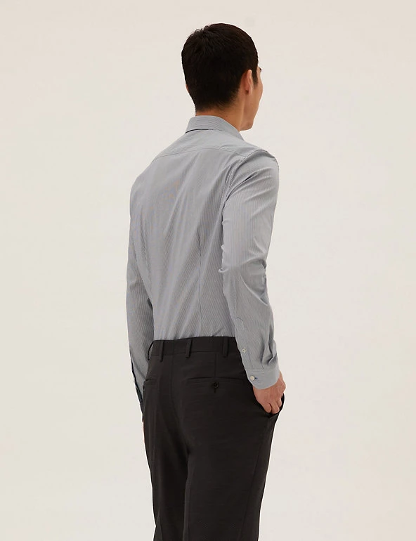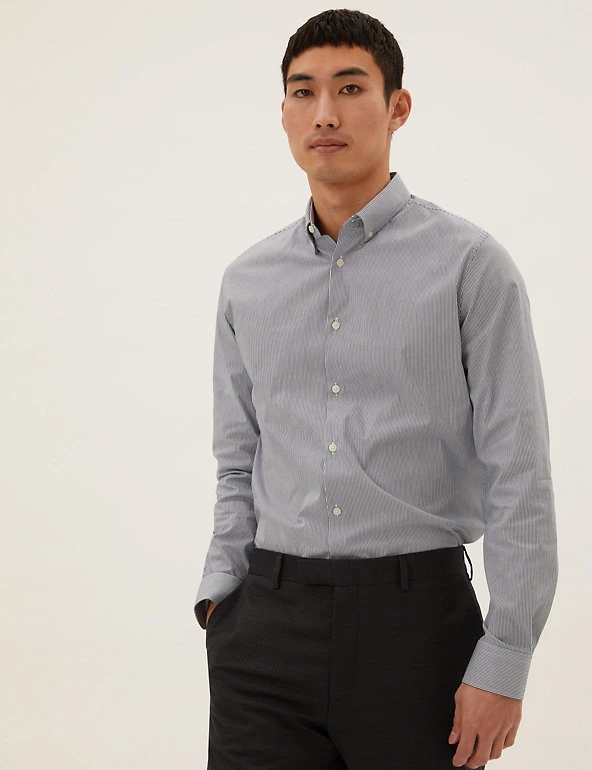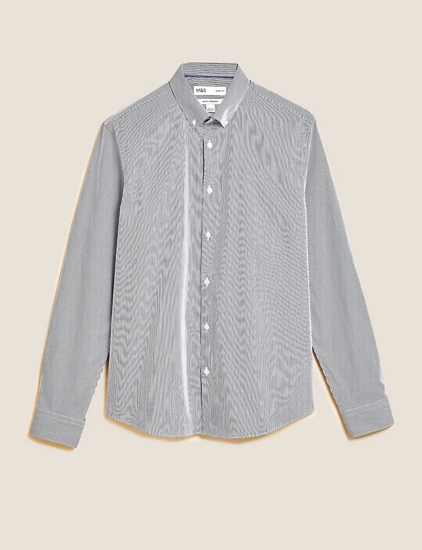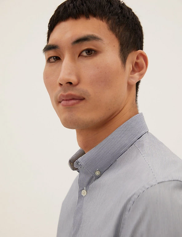 This cotton-rich striped shirt is smart, redefined. It’s cut to a flattering slim fit and features added stretch for extra comfort. An easy-to-iron finish means it just needs a quick press and you’re ready to go. We only ever use responsibly sourced cotto