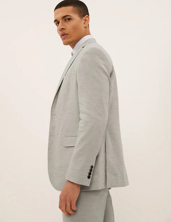 Made using Italian Linen Miracleâ„¢ fabric with stretch, this stylish jacket looks and feels like pure linen but creases less so you stay looking smart all day. It has a tailored fit for a sharp silhouette, with classic notch lapels. This fully lined piece has a single-breasted design with three front pockets, and a soft natural shoulder for a contemporary feel. It’s finished with side vents and decorative stitch detail. Our easy-iron technology means it only needs a quick press before it’s ready to wear. Made with recycled polyester.