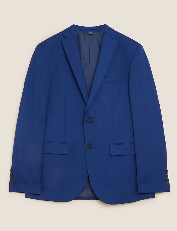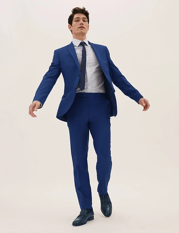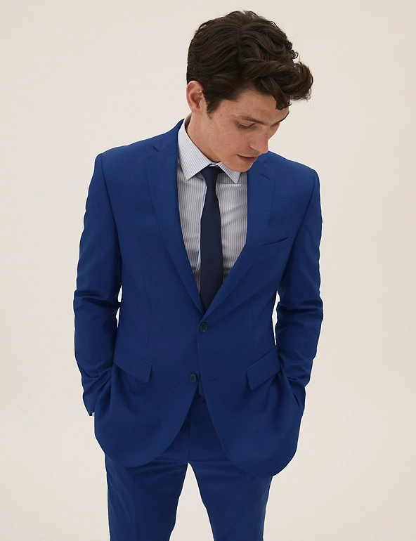 Make a suave statement in this bright blue suit jacket. It’s cut in a modern slim fit with a single breasted front. Added stretch makes sure it’s easy to move in. Tailoring through the front, flap pockets and peak lapels deliver a sharp look.