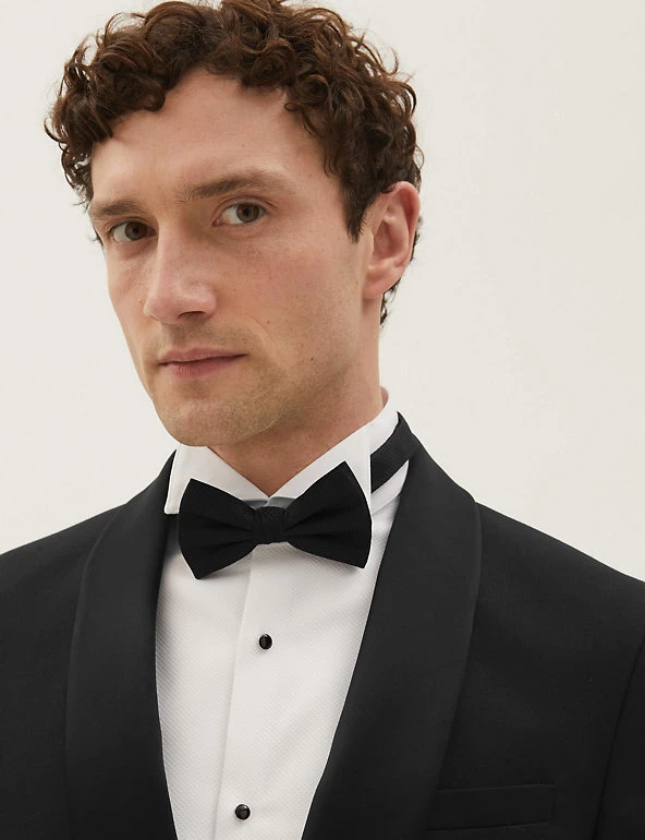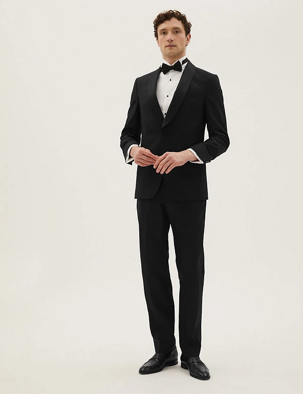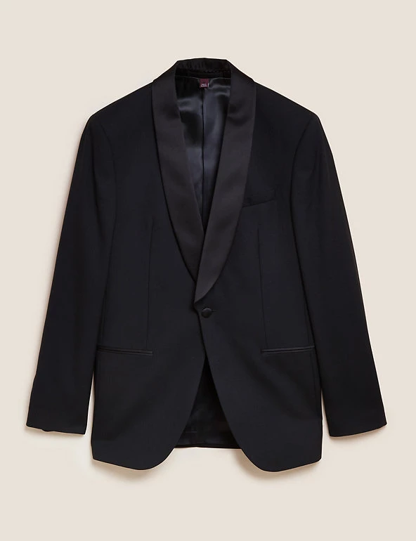 Cut a dash at black tie events in this pure wool tuxedo jacket. It’s designed in a smart tailored fit, with a sateen shawl collar and satin-covered button fastening. This single breasted piece is finished with twin vents and jetted pockets.