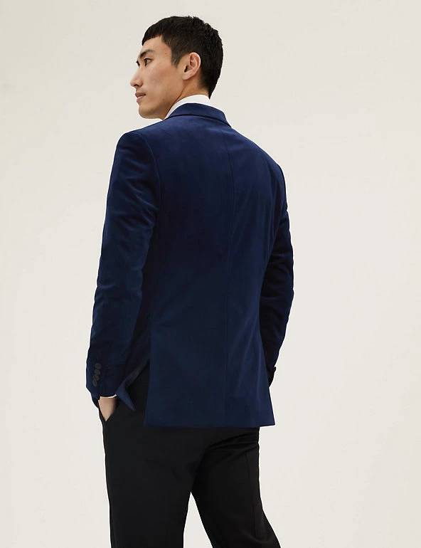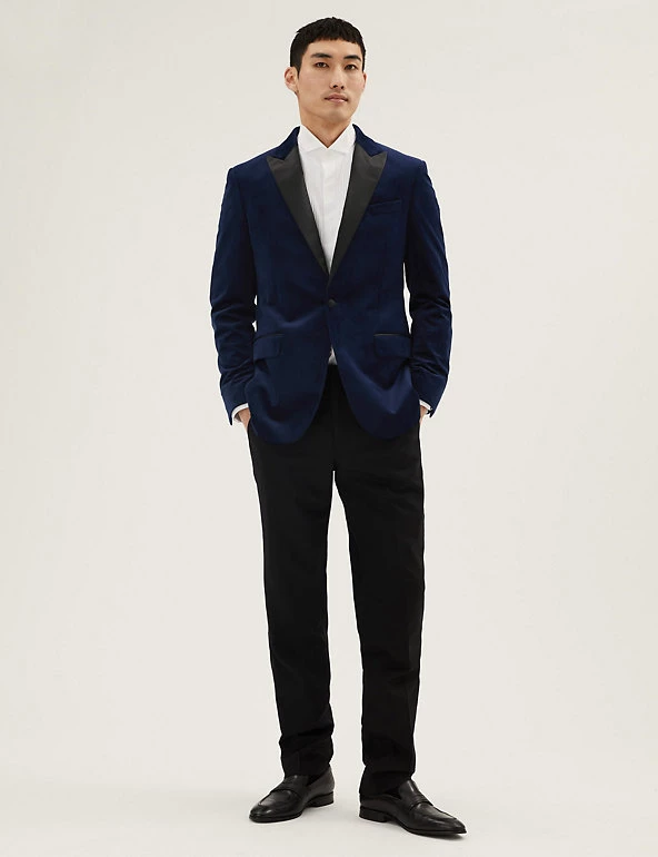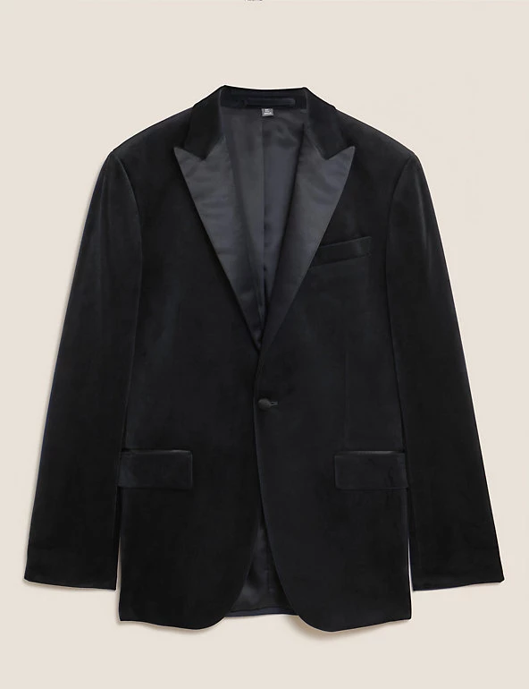 Add extra refinement to your evening attire with this smart velvet jacket. It’s cut to a neat slim fit in a classic single breasted design, with two flap pockets and one jetted pocket. A satin peak lapel and piping detail on the pockets add dapper finishing touches.