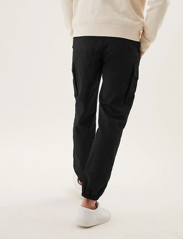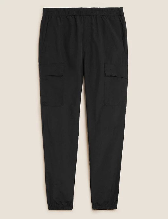 Create a laid-back look in an instant with these classic joggers. Cut slim through the leg and cuffed at the ankle for a flattering fit. Pull-on style with a comfy elasticated waist. Handy flap pockets on the side of each leg add the finishing touch. Made with recycled nylon.