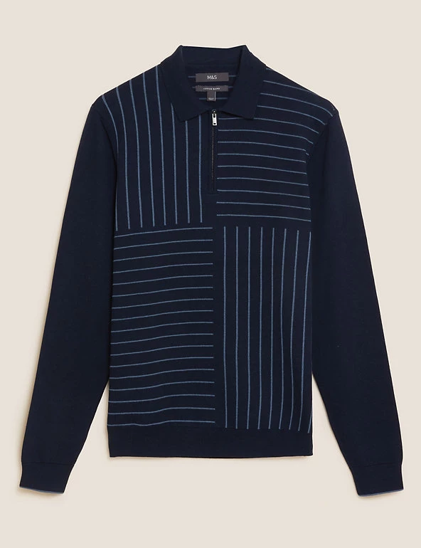Contrast stripes give a contemporary feel to this cotton-modal polo shirt. Long-sleeved design, with a zip-up fastening and a classic collar. Knitted fabric brings a textured finish.