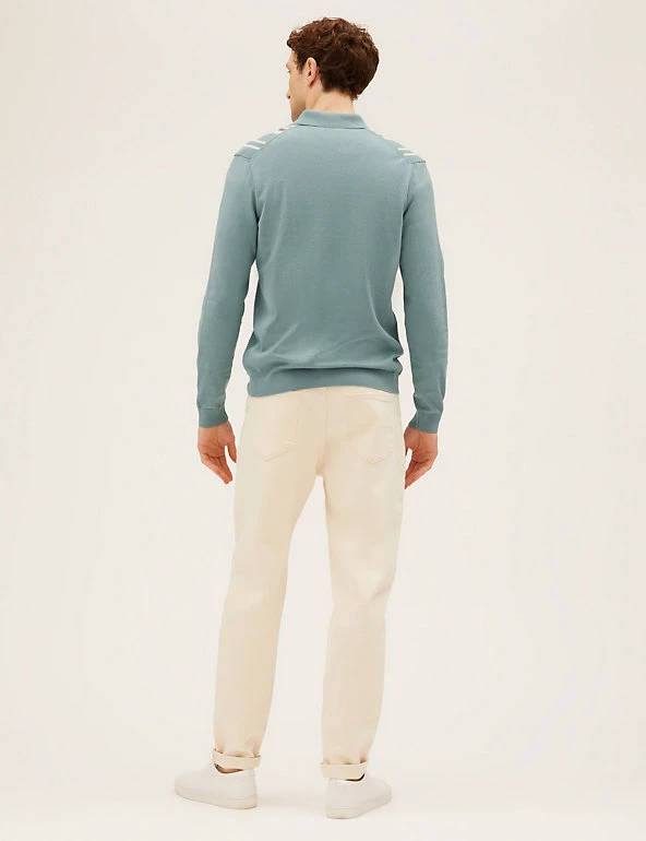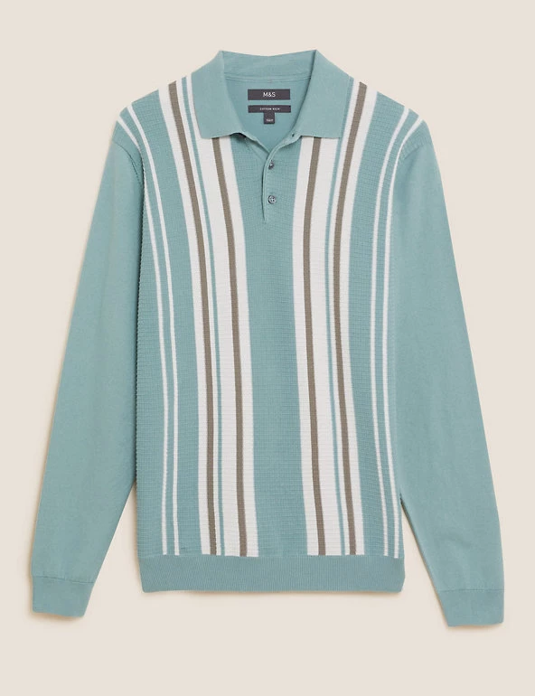 Add a retro-inspired charm to your knitwear with this cotton-rich polo shirt. It features a classic collared neck, plus long sleeves and ribbed hems for warmth. Striped design, with a stylish textured finish.