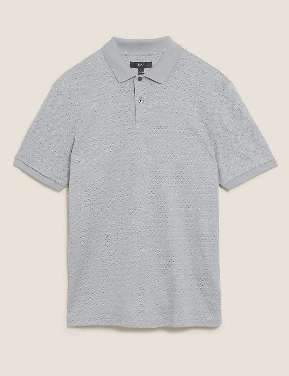 This classic polo shirt is crafted from smooth interlock pure cotton for a truly premium feel. Easy regular fit design with short sleeves to keep you cool. Collared neck and button fastening provide authentic styling. Subtle geometric print. We only ever