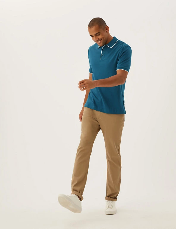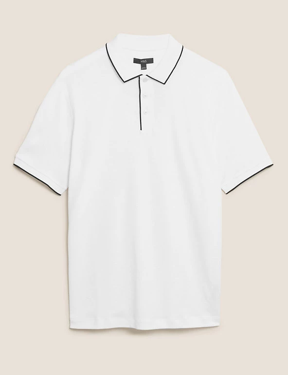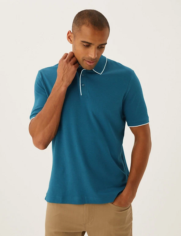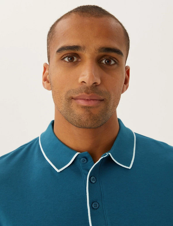 This pure cotton polo shirt features tipped detailing on the collar and cuffs for a modern edge. Cut to a comfy regular fit. Classic button fastening and breezy short sleeves. Interlock fabric gives a smooth feel for a premium finish. We only ever use res