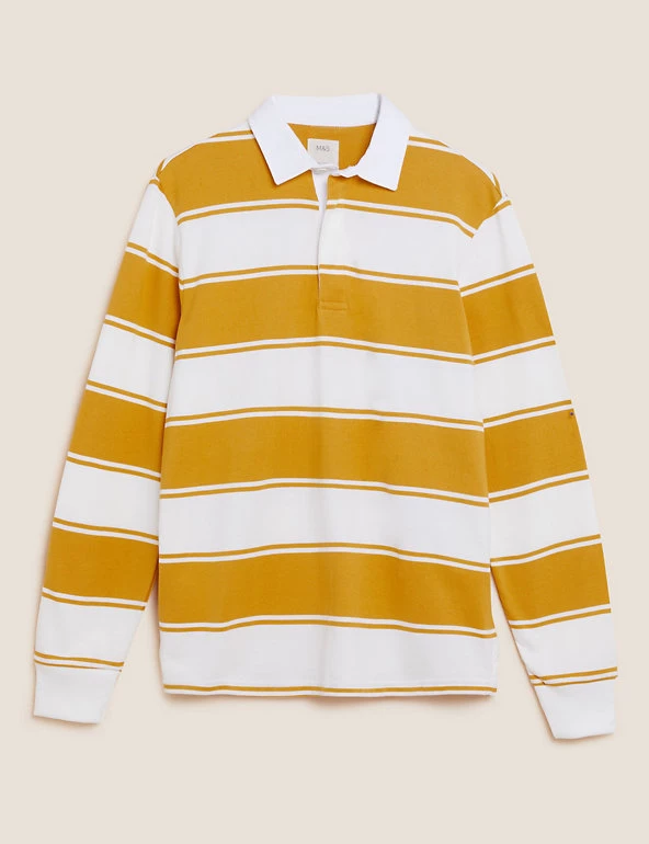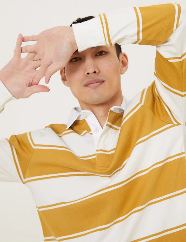 No wardrobe is complete without a weekend rugby shirt, and this pure cotton style is a true classic. It’s designed in a comfortable regular fit, with the traditional contrast collar and covered button placket. Bold stripes give an extra sporty feel. We only ever use responsibly sourced cotton for our clothes.
