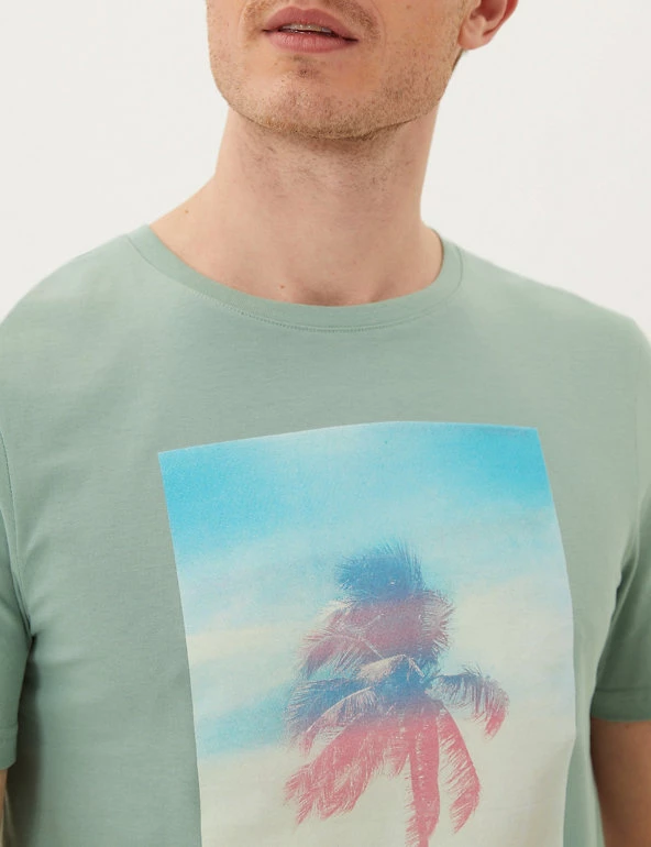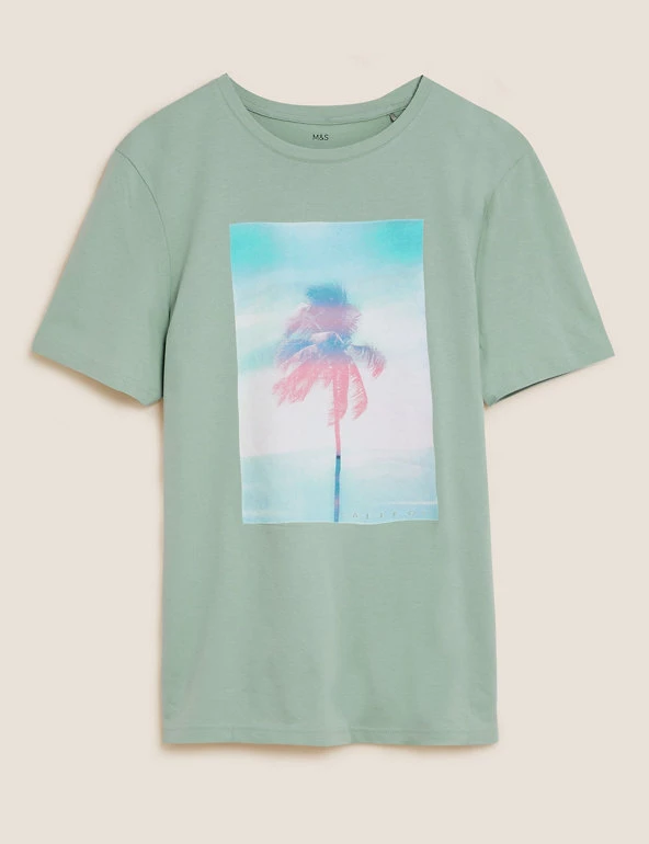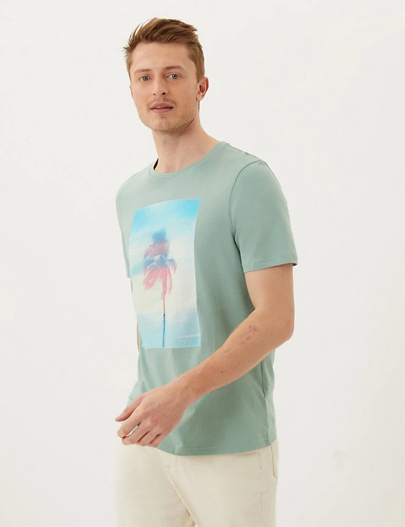 Bring a summery feel to your casual wardrobe with this pure cotton palm tree t-shirt. Regular fit, with a crew neck. Graphic has a cool photoreel effect. We only ever use responsibly sourced cotton for our clothes.