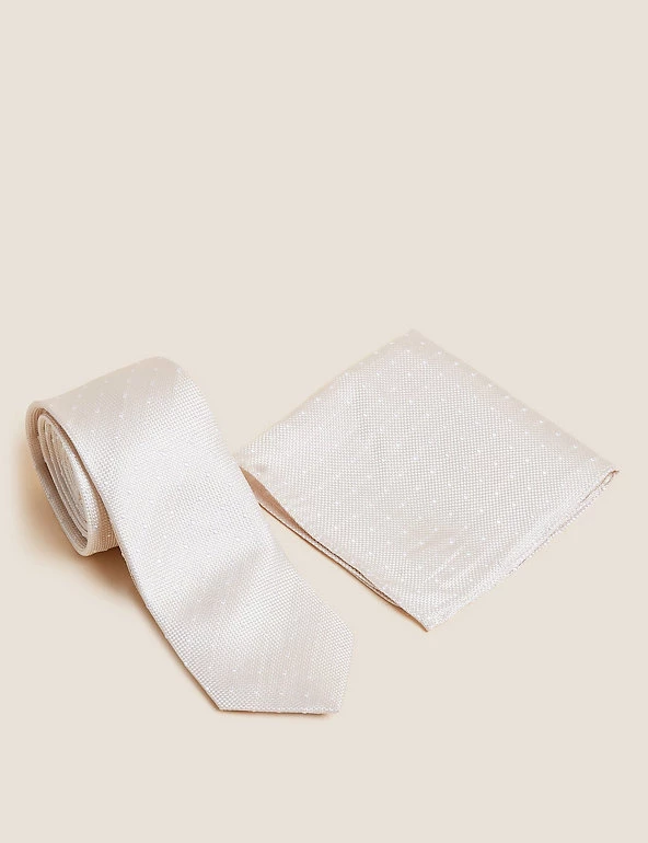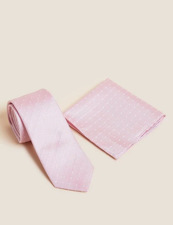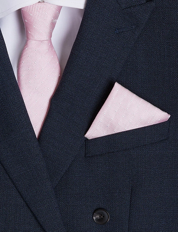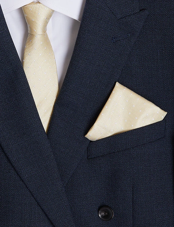 Create a coordinated look with this pure silk tie and pocket square set. The tie comes in a modern slim shape. Both pieces feature a versatile spot design.