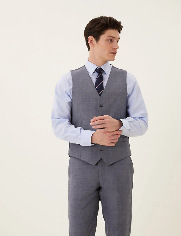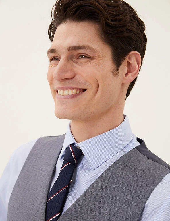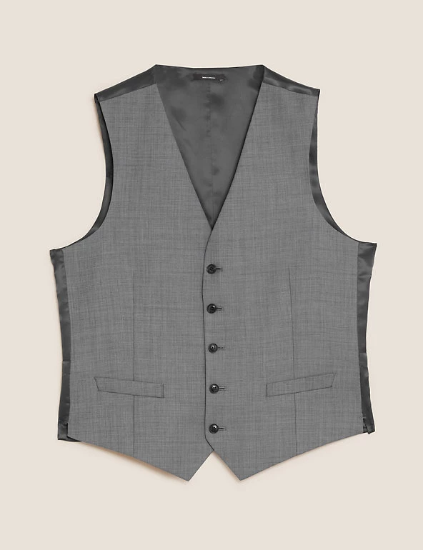 Cut a dash at any formal occasion with this pure wool waistcoat. It’s made to a sleek tailored fit with a textured sharkskin weave. Added Lycra® means it moves with you, and it’s lined for comfort. It fastens with buttons and is finished with a slanted, jetted pocket. Wear it as part of a three-piece suit for work, weddings and events.
