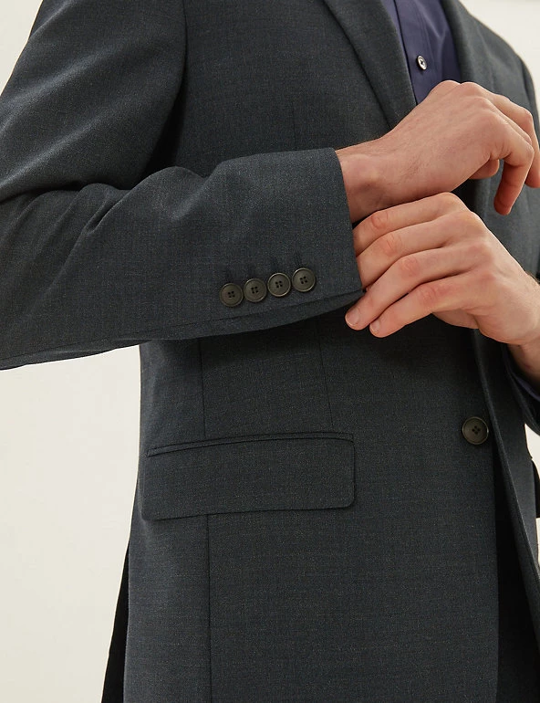 Product Style: Single breasted 2 button, Tailored fit, Button fastening, Lined, Vents: Two, Trouser Style: Flat front, Added Stretch