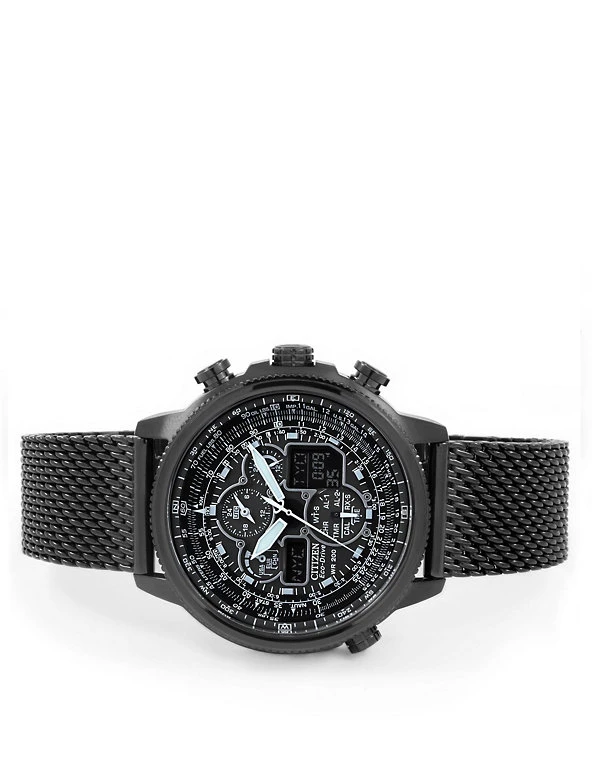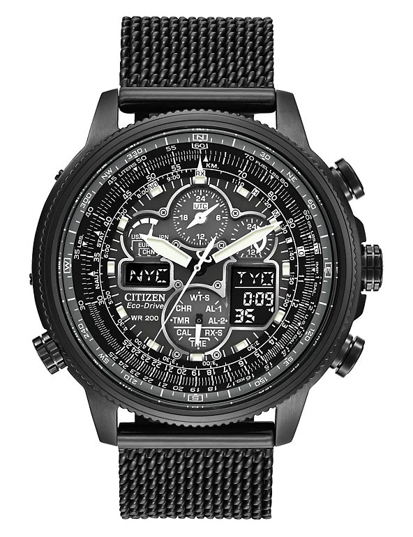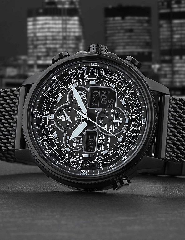 Take your timepiece to the next level with this ultra-modern watch from Citizen. The robust black Navihawk presents a multifunctioning dial with a 24-hour format that shows the corresponding time in a range of world cities for an international feel. With its chronograph design, it can also double as a stopwatch. Luminous white markers and hands provide eye-catching contrast against the dark dial for a standout display. The intricately designed steel bracelet creates a stylish finish.