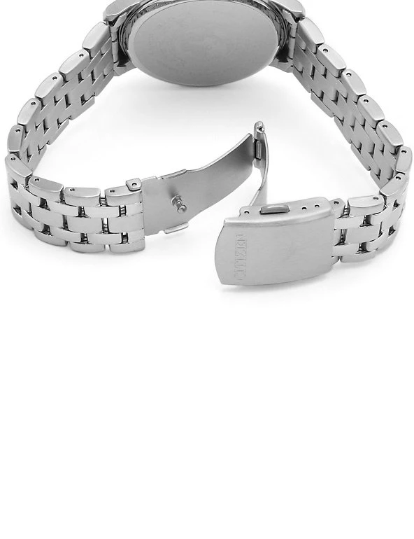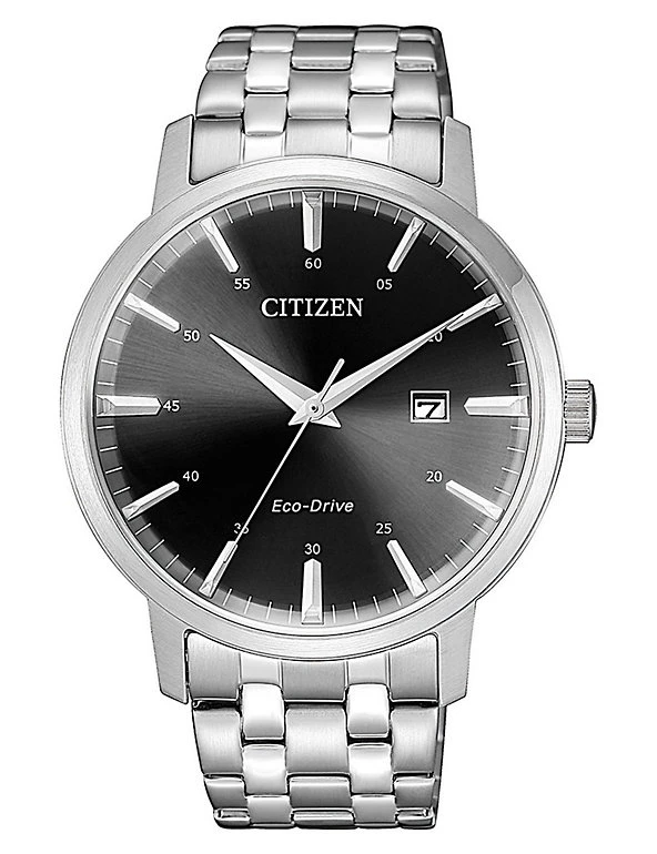 This sophisticated watch from Citizen is a classic you’ll wear for years to come – and thanks to the brand’s Eco-Drive technology, it’ll never need a new battery. A sleek stainless steel casing surrounds a classic round dial in stylish black. It features three hands, indices for the hour and second markers and a handy date window at 3 o’clock. The stainless steel link bracelet adds a stylish touch, and is fastened with a clasp closure.