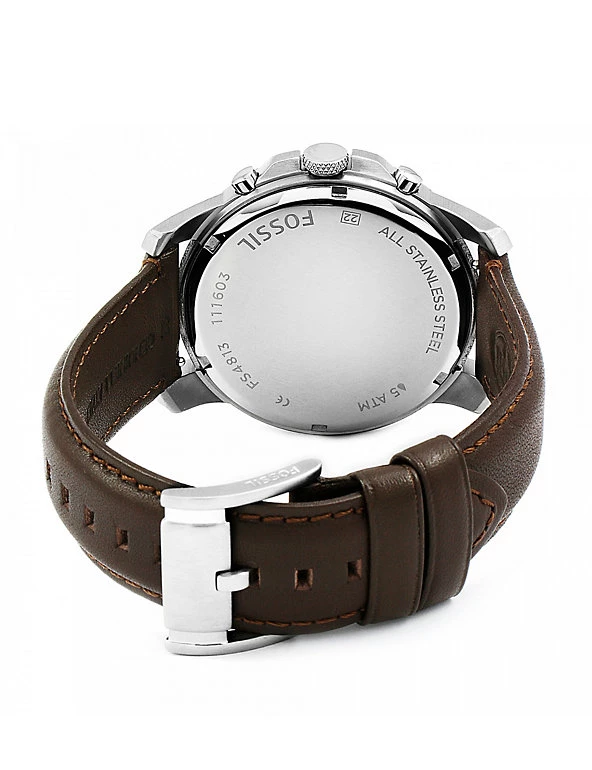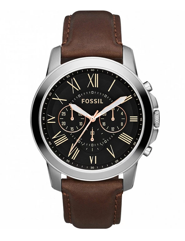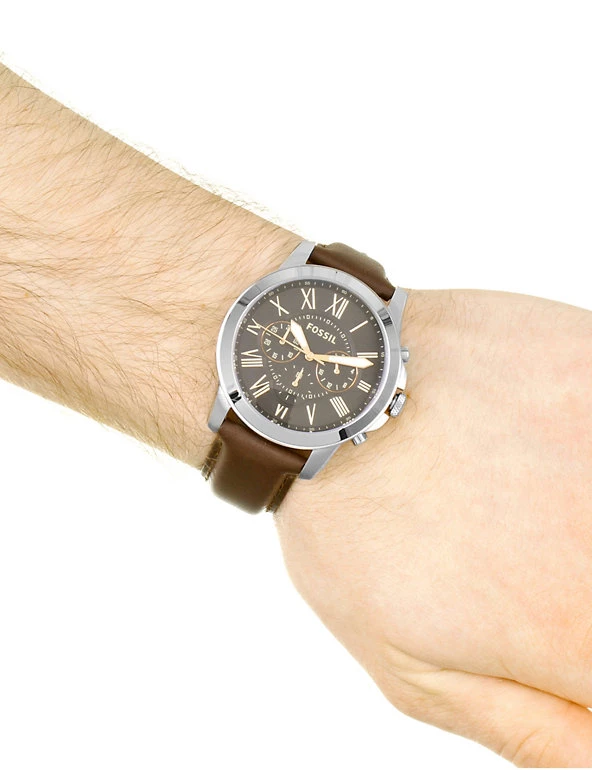 The sophisticated Fossil Grant watch is ideal for every day. A large silver-tone dial features a coordinating-coloured minute counter around the edge as well as three hands, Roman numerals and signature branding in gold-tone shades. This versatile design features subdials which display the date, hour and seconds. Plus, the chronograph function means this timepiece can be conveniently used as a stopwatch. The brown leather strap adds to the sleek aesthetic and fastens with an adjustable buckle for the perfect fit. This stylish piece is water-resistant to 50 metres for extra practicality.
