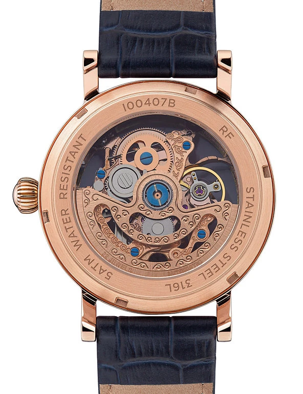 With its bold gold casing and contrasting navy details, the Herald watch by Ingersoll is a true statement piece. Its automatic mechanism is powered by your body’s natural movements, to keep it charged without the need for winding or batteries. The dial features an exposed skeleton interior complete with cogs, jewels and springs for a timeless feel. Around the face, gold batons are set against a blue textured background to mark out the hours. The navy leather strap has a croc-effect finish for extra luxe and is fastened with a buckle.