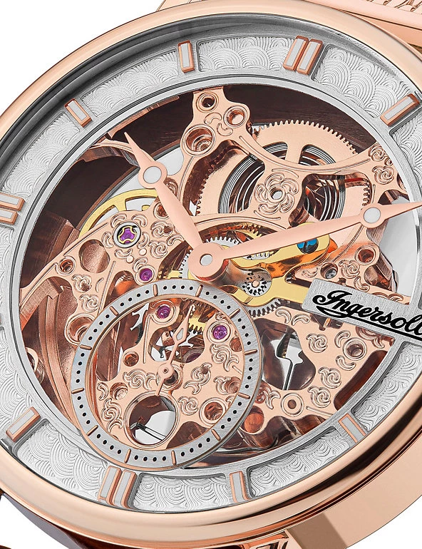 The Herald analogue watch by Ingersoll combines a traditional look with contemporary craftsmanship. A substantial gold-tone case houses an intricate skeleton mechanism, with the cogs, jewels and springs all visible. Around the dial, a silver-tone surround is embellished with subtle wave patterns, contrasting with the gold baton hour markers. Its automatic movement is powered by the natural movements of your body, so you never need to worry about winding it. Plus, the understated mesh bracelet has a fully adjustable fastening for maximum comfort and comes with a water resistance of 50m.