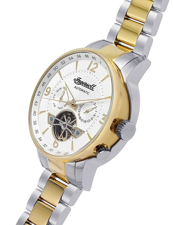 From one of the oldest watchmakers in America, this Ingersoll watch is all about classic style. It has a white dial with gold-tone hour markers and numbers at 12, 3, 6 and 9 o’clock. Two subdials with the day and date add extra functionality and you can even see the inner workings of the watch with the brand’s signature cutaway subdial. The chunky chain link bracelet is made from stainless steel with gold-tone accents and fastens with a clasp. This automatic watch is powered by your wrist movements so there’s no need for battery replacements – and it’s water-resistant to 50m for added practicality.