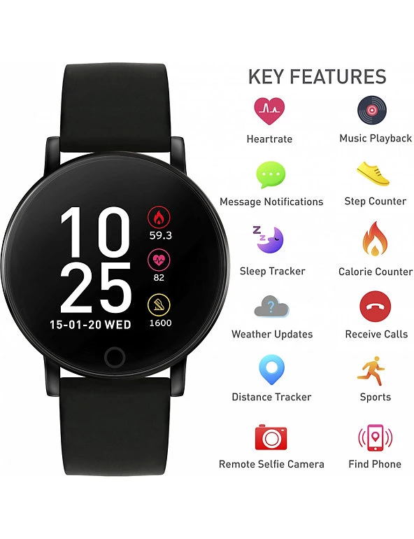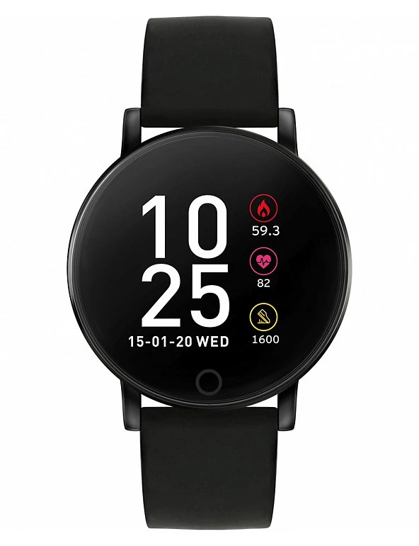 Stay on top of your health and fitness with this digital smartwatch from Reflex Active. It tracks your steps, calories and distance covered, and logs the impact of activities such as bike rides, gym sessions and runs. Call and message notifications keep you in touch, and real-time weather updates give useful information to plan your day. You can even monitor the quality of your downtime, with a sleep tracker that keeps working while you rest. Connect it to your smartphone to enable the ‘Find a Phone’ and remote selfie camera control functions. This watch has a round face, mounted in a sleek black stainless steel casing. Its ultra-comfortable black rubber strap is fastened with a buckle.