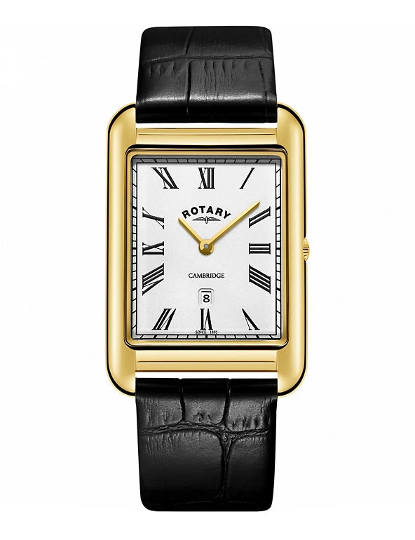 This timeless watch from Rotary will add refined style to your wardrobe. It features a luxe leather strap with a croc-embossed print and a buckle fastening. The rectangular stainless steel face has a sapphire glass front, with a date window at 6 o’clock for further practicality. This sophisticated timepiece is elevated by gold-tone detailing and signature branding and comes with a water resistance of up to 50m.