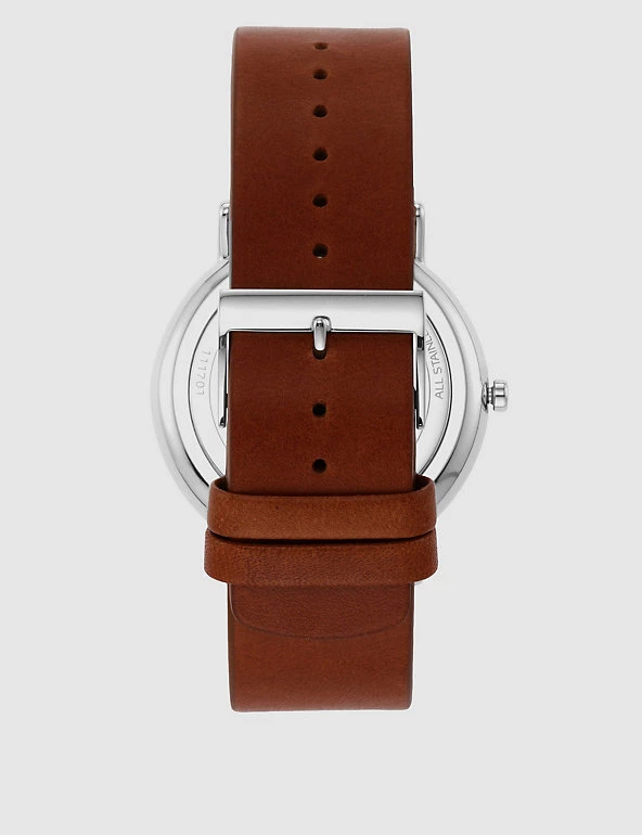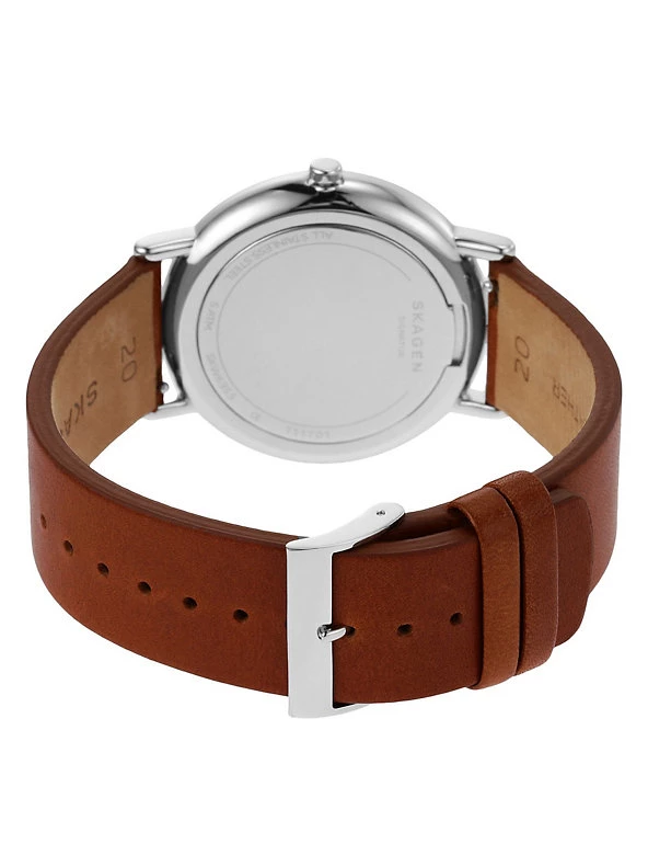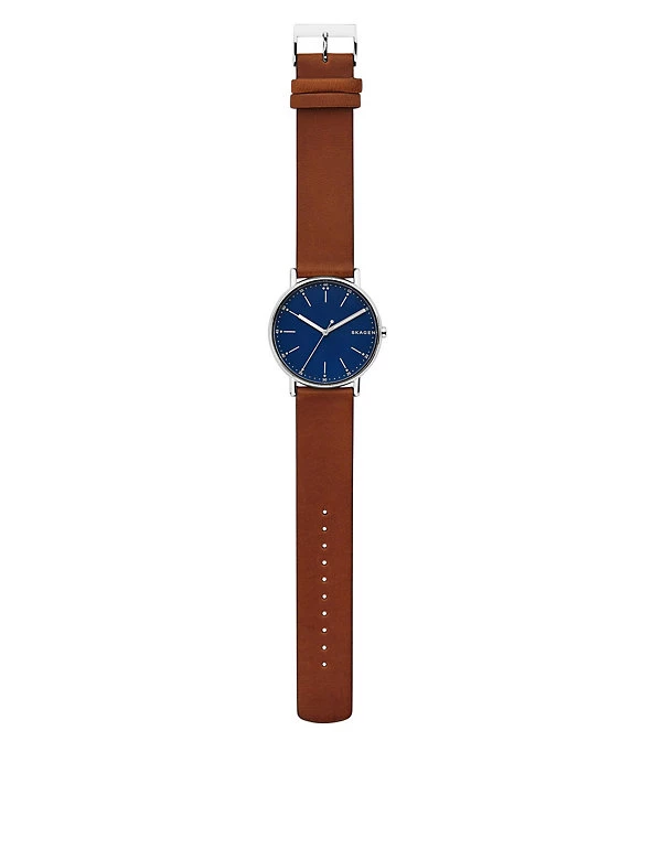 The sleek Signatur watch from Skagen has timeless appeal and is ideal for day or night. It features a strap crafted from brown leather for everyday wear and is elevated by a stainless steel adjustable buckle and bezel. This elegant timepiece has a blue face for a pop of colour and silver hands for a contemporary touch. Plus, it’s water-resistant up to depths of 50m, giving you peace of mind when out and about.
