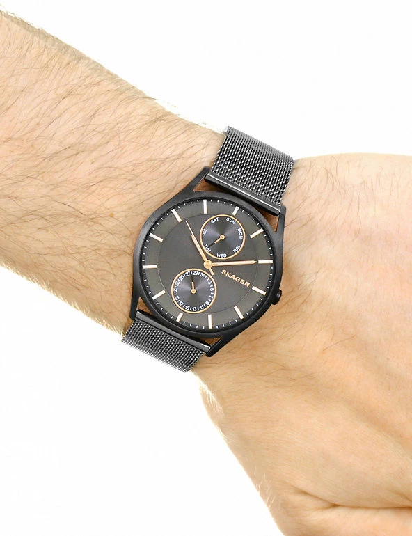 This Skargen quartz-powered watch blends sophisticated style with reliable precision. The classic round dial features separate day and date sub-dials and slender hands. The rest of the face is minimal, with repeat hour and second markers set against a plain grey background with a small brand logo. A water-resistant finish of up to 50m makes this piece perfect for everyday use. The adjustable mesh bracelet is finished with a clip fastening, giving this classic analogue design a modern touch.